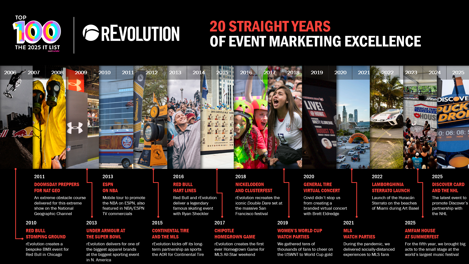 Founded in 2001, rEvolution has shown a remarkable ability to adapt to an evolving marketplace, demonstrated by our consistent recognition from outlets like Event Marketer. As we celebrate our 20th year on the Top 100 It List, we look forward to serving our clients with remarkable experiential marketing solutions for another 20 years.